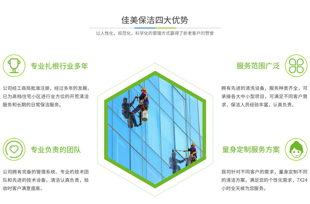 馬鞍山市佳美保潔服務(wù)有限公司是一家經(jīng)工商部門批準,具有法人資格專業(yè)清洗,馬鞍山保潔服務(wù)的公司,自創(chuàng)辦以來,一直致力于企業(yè),家庭,賓館,學(xué)校,別墅,酒店,商廈,公共設(shè)施等場所提供科學(xué)的日常保潔和清潔保護的服務(wù)公司,有著豐富的管理服務(wù)和保潔經(jīng)驗...